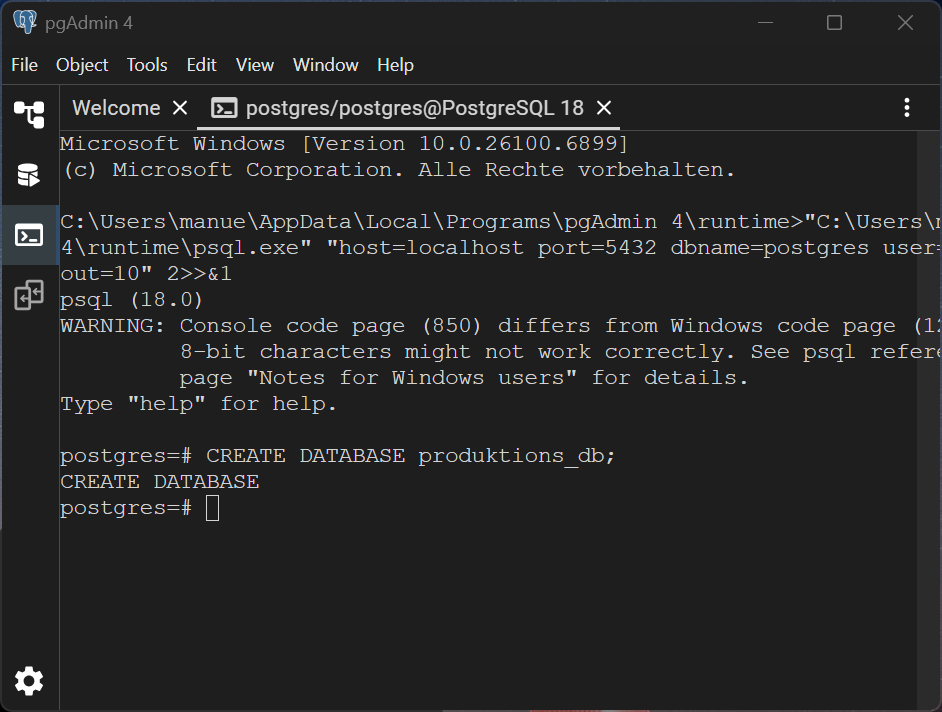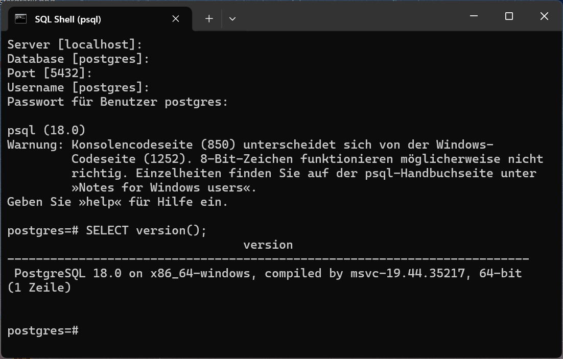 Es sollte die installierte Version angezeigt werden (z.B.psql --versionpsql (PostgreSQL) 18.x) -