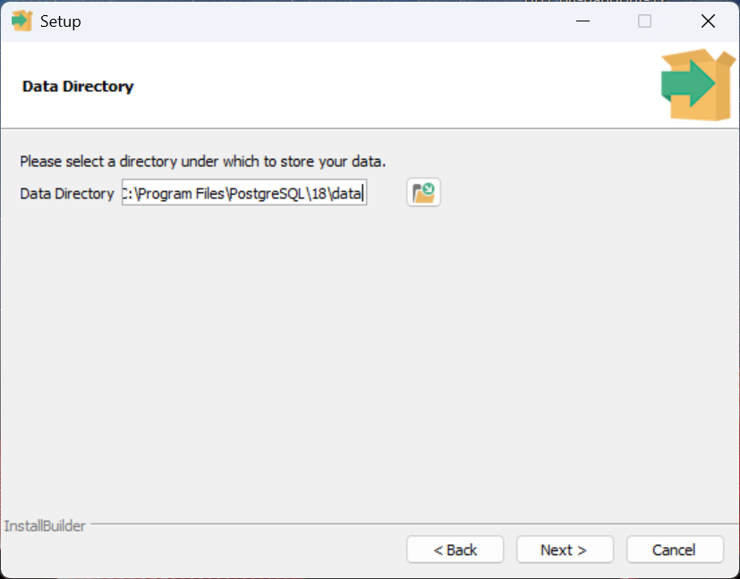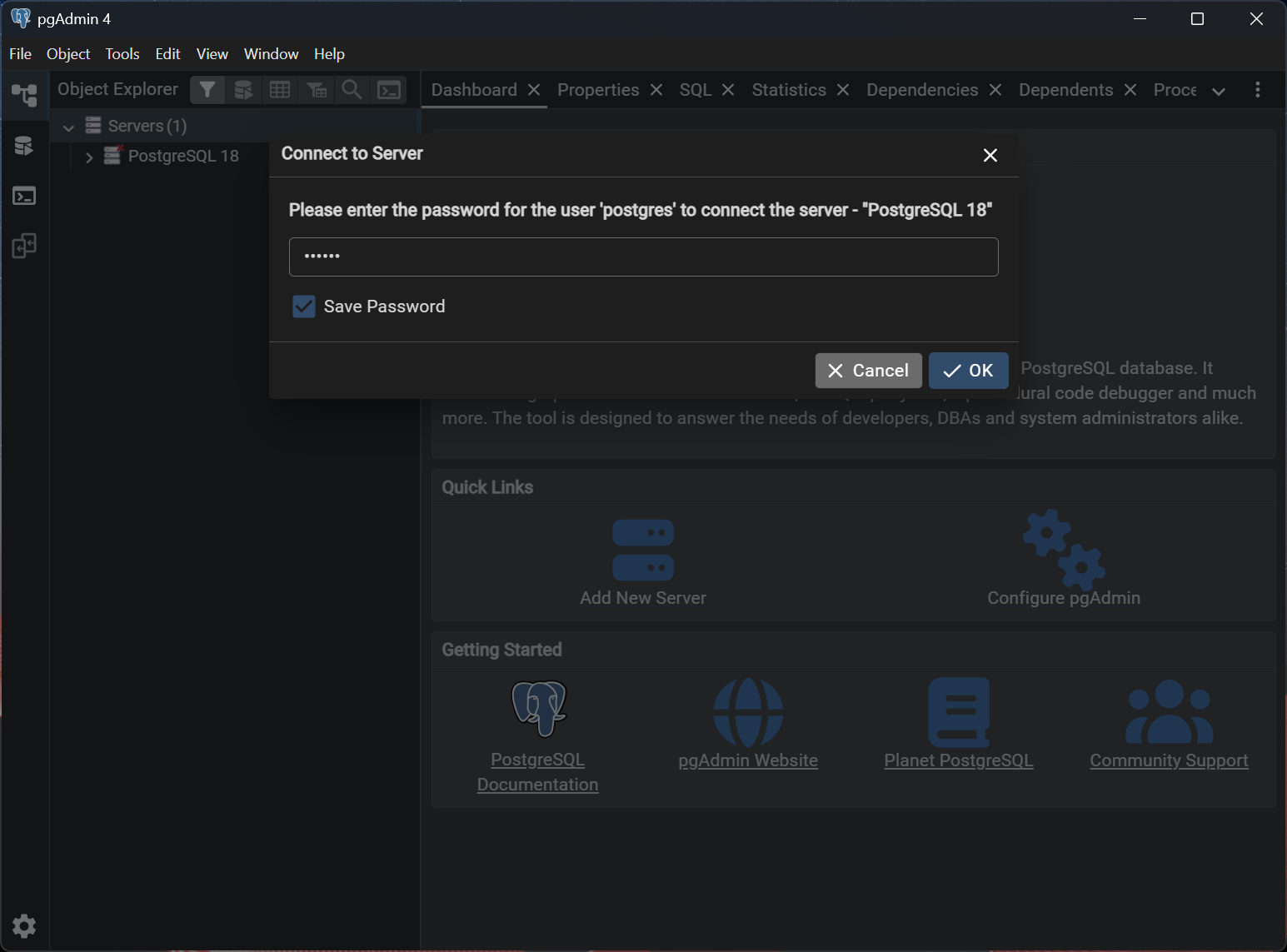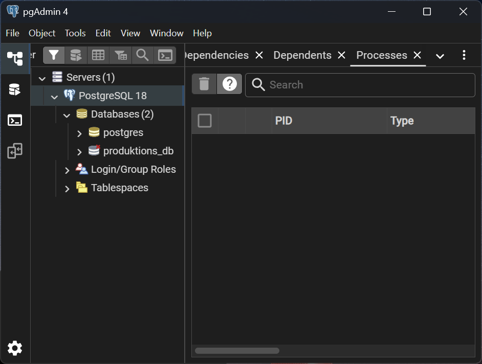 - Da wir bei der Installation von PostgreSQL bereits eine lokalen Server erzeugt haben, sollte hier nun bereits 'PostgreSQL 18' stehen.
