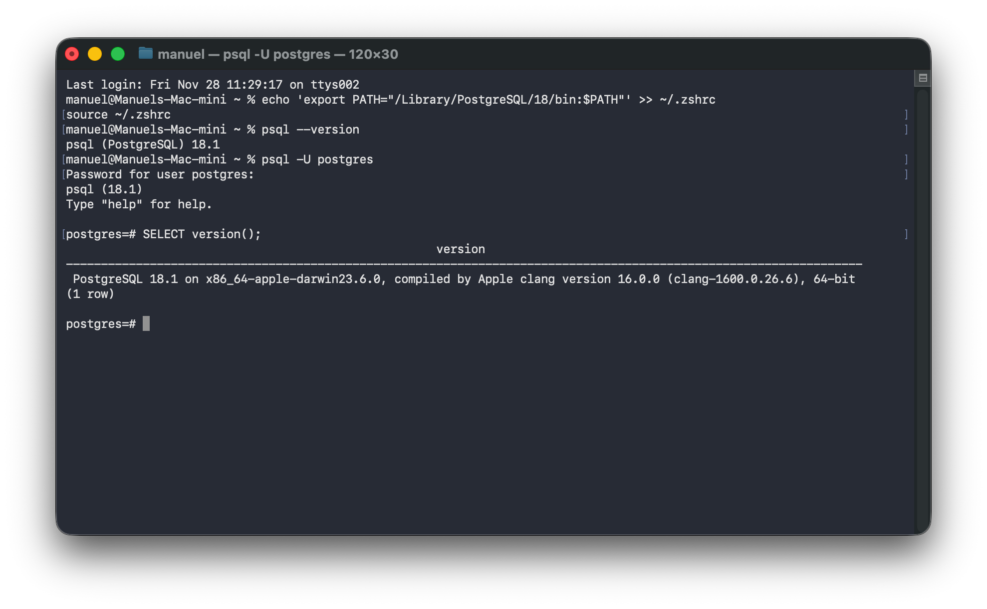 psqldirekt aufrufen kannst):echo 'export PATH="/Library/PostgreSQL/18/bin:$PATH"' >> ~/.zshrc source ~/.zshrc -